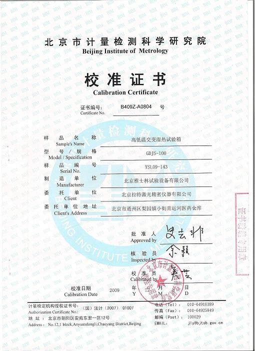 >>高低溫交變濕熱試驗箱校準證書-北京計量院-拉特激光