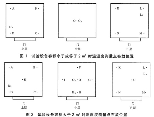 恒溫恒濕試驗箱濕度測量儀器采用干濕球溫度計或由其他濕度傳感器組成的濕度測量系統,其測量結果的擴展不確定度不大于被測溫度允許偏差的1/3。 恒溫恒濕試驗箱濕度測量點數量及位置要求: 一,根據試驗設備容積的大小,將工作空間分為上、中、下三層,中層通過工作空間幾何中心點,將一定數量的相對濕度傳感器布放在其中規定的位置上,傳感器不應受冷熱源的直接輻射。 二、相對濕度測量點用Oh、Dh、Hh、Lh表示。Oh位于中層的幾何心心,其他各測量點與試驗設備內壁的距離為各自邊長的1/10,但最大距離不大于500mm,最小距離不小于50mm。 三、恒溫恒濕試驗箱容積小于或等于2m3時,相對濕度測量點為3個,如圖1所示。試驗箱容積大于2m3時,相對濕度測量點為4個,如圖2所示。當試驗箱容積小于0.05 m3或大于50 m3時,可適當減少或增加測量點。 四、每5min溫度平均變化速率測量點為工作空間幾何中心點。