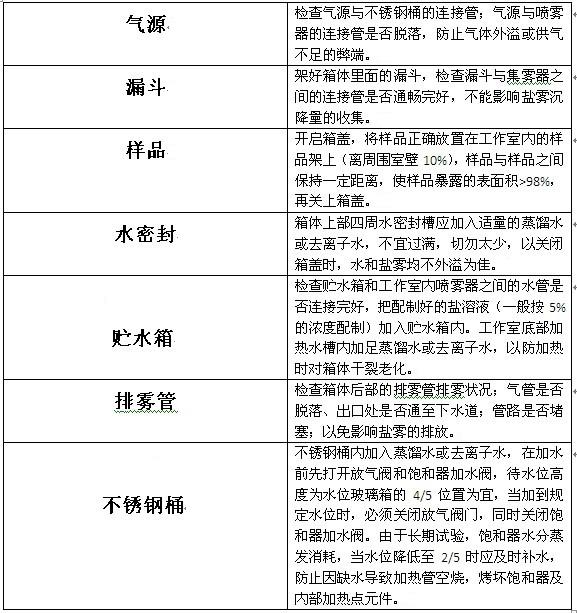 我們都知道,初次使用鹽霧試驗箱有很多講究,更是要做好十足的準備工作。那么,究竟在啟動鹽霧試驗箱前我們要注意哪些事項,如何做好充足的準備?下表是小編整理的關(guān)于鹽霧試驗箱啟動前需做的準備工作,感興趣的朋友不妨一起來看看吧。