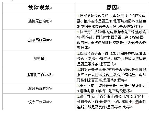 很多人可能會(huì)對(duì)高低溫試驗(yàn)箱偶爾出現(xiàn)的異常狀況弄的一頭霧水,下面就有請(qǐng)專業(yè)技術(shù)工程師為我們講解高低溫試驗(yàn)箱出現(xiàn)異常狀況時(shí)我們應(yīng)該怎么處理,下面的一張表讓你明明白白,大家可簡(jiǎn)單的對(duì)號(hào)入座。